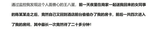 当事人在后续通过酒店监控发现,前一天夜里在另外一位女同事走后,其上级独自回到酒店前台办理了房卡,这才使得当事女员工房门被轻易打开,发生后续悲剧。