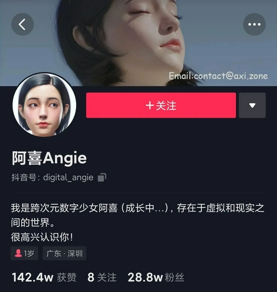 “真实性”是其最大特征,点开“阿喜Angie”的抖音视频,可以看到一个高度真实的“虚拟少女”:头发丝毫可见、脸上有着小雀斑、微笑时可以看到皮肤和肌肉的微小变化。