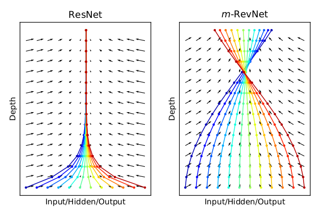 两篇文章都提出了替换残差网络的前向方程方法,也同样讨论了这种方法的好处:由于ODE机制中的动量,可逆性和更大的表征容量减少了内存负载。