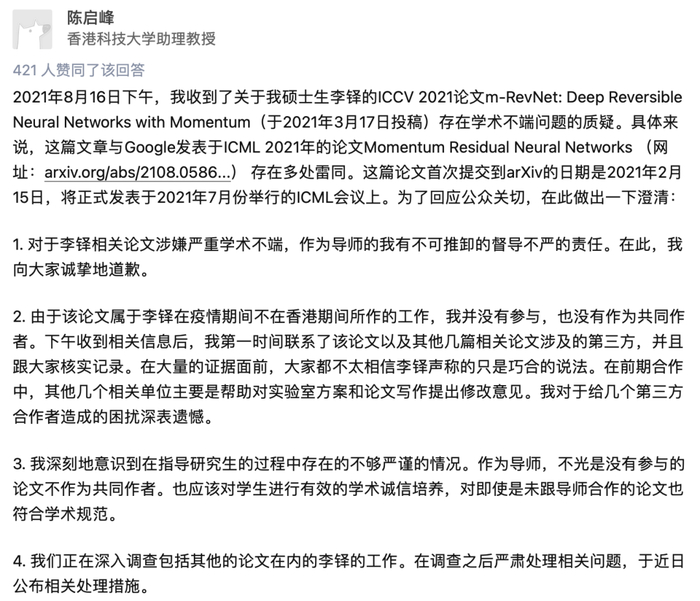 兹事体大,不仅ICCV作者撤回了Arxiv上的论文,他的导师也在知乎上发文致歉,表示自己有「不可推卸的督导不严的责任」。