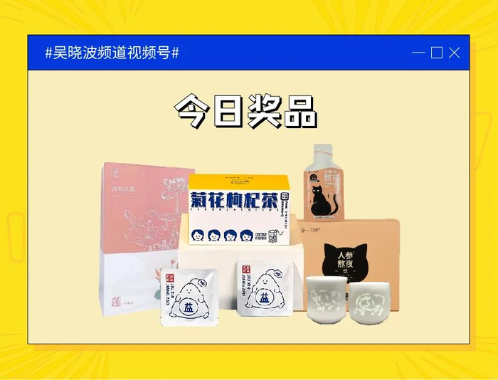 今日吴晓波奖学金:本场直播,我们会发起4轮抽奖,每轮抽1—5人送奖品一份。奖池里的奖品包括:价值39.9元的九信匠造菊花枸杞茶、价值99元的玉柏玲珑杯、价值99元的一気棒熬夜饮和价值169元的妍物四季插画香薰。感兴趣的朋友们千万不要错过哦。