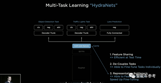“九头蛇网络”可以同时处理目标检测、交通标志识别、车道预测等等任务,其关键在于对各种数据的特征提取,包括不同种类数据的特征共享、对不同任务的分别调参,以及参数缓存,用来加快调参速度。