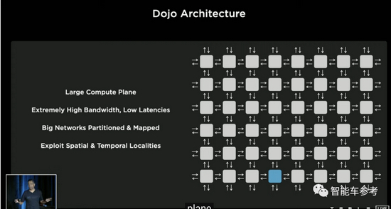 DOJO 是一种通过网络结构连接的分布式计算架构。它还具有大型计算平面、极高带宽和低延迟,以及分区和映射的大型网络。