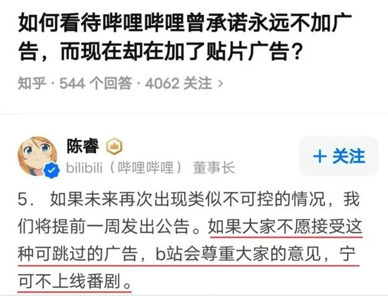 问题是,B站不仅不敢大大方方把广告缝补进视频,还要小心翼翼的人使用信息流推送广告——因为bilibili董事长兼CEO陈睿很早就公开承诺B站不做贴片广告,此举无疑奠定了B站的社区氛围和平台调性,代价是彻底将B站与视频贴片广告割裂成对立面,用户对广告的抗拒甚至比其他平台更敏感,因为对他们而言,在精神社区商业化进程中,很容易出现乌托邦崩塌的幻灭感。