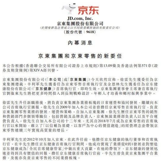 京东:徐雷升任集团总裁,刘强东负责长期战略设计