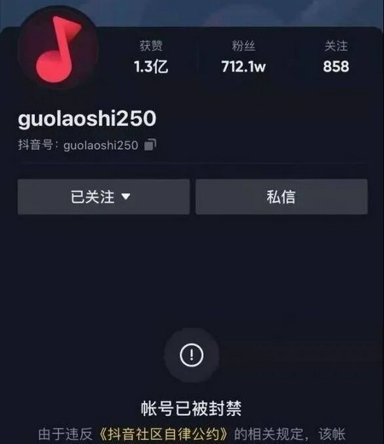 9月2日,有700万粉丝网红“郭老师”的抖音账号被永久封禁。