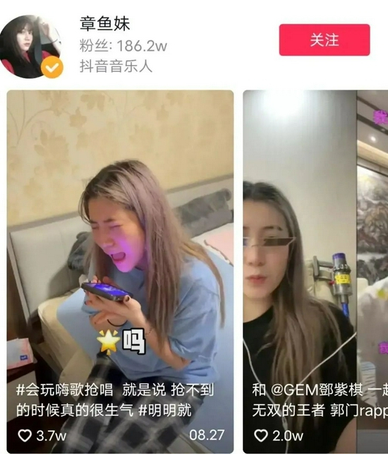 比如抖音186万粉丝的up主“章鱼妹”,靠着模仿郭老师也吸引了不少粉丝。