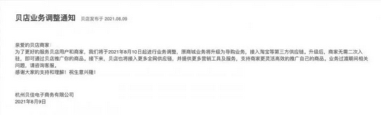 这份贝店发布业务调整通知称,为了更好的服务贝店用户和商家,将于2021年8月10日起进行业务调整,原商城业务将升级为导购业务,接入淘宝等第三方供应链。通知承诺,商家无需二次入驻,即可通过贝店推广你的商品。而贝店也将接入更多全网供应链,提供更多营销工具及服务,支持商家更灵活高效的推广自己的商品。关于业务过渡期间相关问题,通知表示商家有需要可咨询客服。