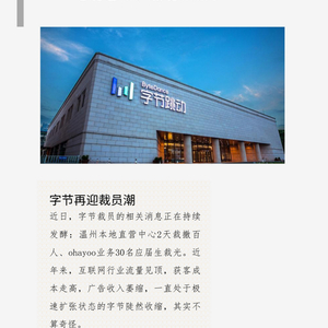 近日,字节被曝温州本地直营中心撤城裁员,游戏业务ohayoo包括应届生在内的大量员工也被裁了,实行N+1赔付。
