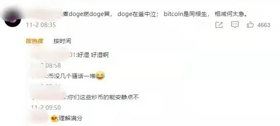 更有人玩起了谐音梗,将这首七步诗改编为“煮doge燃doge萁,doge在釜中泣;bitcoin是同根生,相减何太急”,以此来暗示狗狗币、屎币等各种动物币告别自相残杀,希望和平共处。
