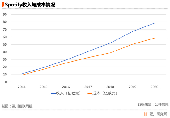 没有规模效应,是“预付款+分成”的版税机制导致的。Spotify每年会预先付给唱片公司一笔钱作为低保。之后,用户每播放一次歌曲,唱片公司会抽一笔钱(大概6-8美分)作为版税。如果唱片公司年内的抽成高于低保,那么Spotify需要补足差额,反之,唱片公司却并不需要退钱[4]。