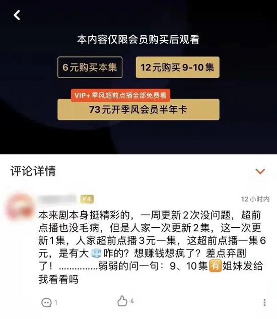 但这一模式引发了用户普遍不满。在遭到上海市消保委、中国消费者协会等有关部门点名后,爱奇艺率先宣布取消剧集超前点播,连带着也取消了“会员专属”的贴片广告。通过超前点播与会员广告来增加收入的路径无疑已经被堵上了。