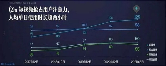 短视频的繁荣不仅争夺了长视频的广告份额,还抢占了用户的时间。《2021年中国网络视听发展研究报告》显示,自2017年12月份起,短视频人均单日使用时长逐年递增,从2017年的76分钟逐步增长到2021年的125分钟。与之相对的是,长视频的人均单日使用时长已趋于稳定,2020年还呈现出下滑趋势,最终定格在今年3月份的98分钟上。