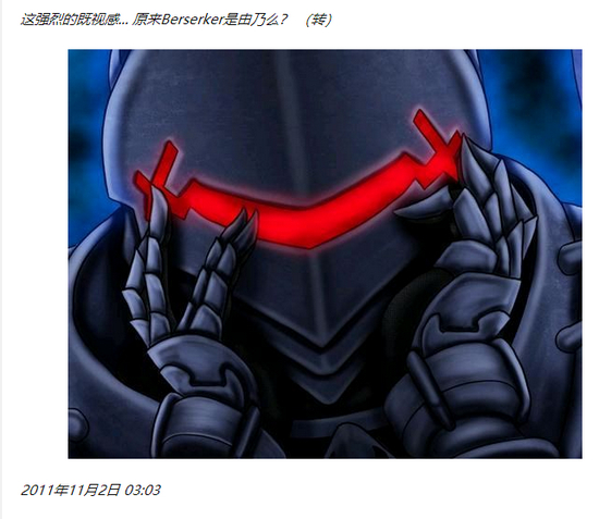 图里的人物是动画《Fate/Zero》中的狂战士职阶英灵兰斯洛特;而“由乃”指的是动漫《未来日记》中的女主角我妻由乃,属于标准的病娇角色,手捧双颊则是她的招牌动作,陈睿在这里开脑洞做了一个联想——