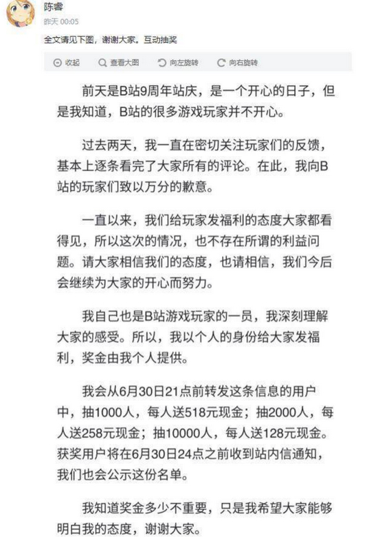 而官方尤其是陈睿对此的回应,现在看来更像是一场公关事故:用给全体B站用户抽奖的方式淡化事件影响,被玩家们认为是在间接地孤立分化《FGO》玩家,结果既不治标也不治本,反而让事态进一步升级——NGA、百度贴吧等论坛上众多玩家发起了“7月不氪”的联名活动,最后还是官方微博发布道歉长文,才逐渐平息了此事。