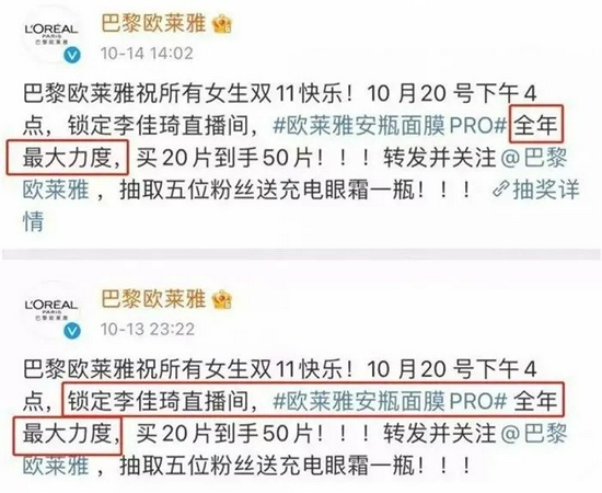 此前,巴黎欧莱雅预售一款面膜,在薇娅和李佳琦的直播间售价为50片429元,欧莱雅官微称这是全年最大的优惠力度。