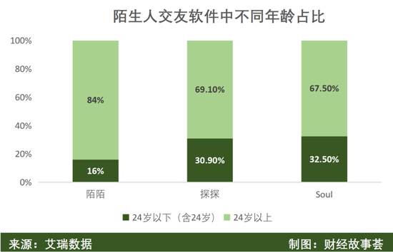 进一步划分,年轻人多数集中在陌陌和探探里,平均每3个玩探探和Soul的用户,就有1个是24岁以下的年轻人,而在陌陌里,这个比例要小得多,仅为16%。