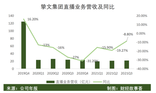 2021年Q3,直播服务为集团贡献了58%的营收,实现21.67亿元的收入,但同比减少8.8%,继续延续2020年以来的直播负增长疲态。