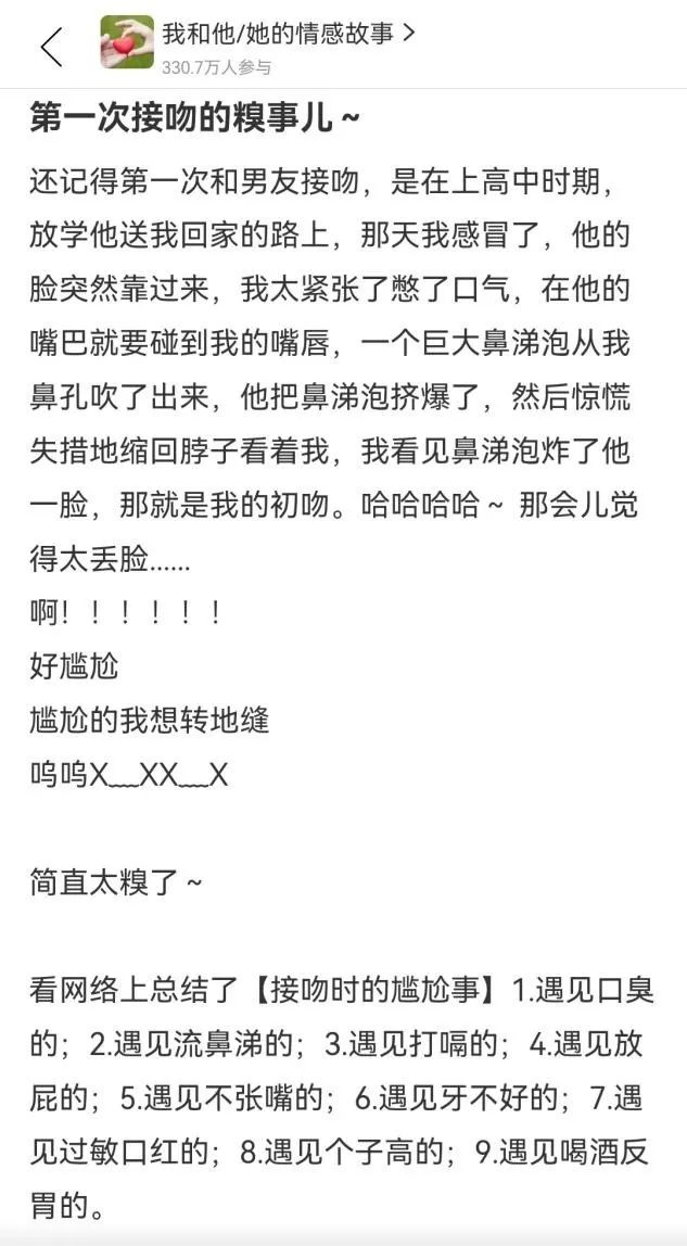 在“我和他/她的情感故事”小组中,最热门的话题,便是第一次接吻过程中发生的糗事。不止一位女性用户,在话题下详细地记录了和男友第一次接吻的经过,以及当时的心路历程。