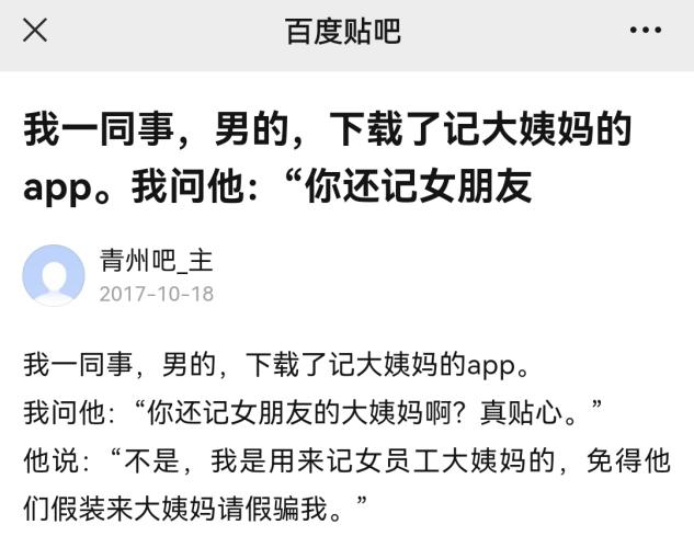 除此之外,还有极少部分的奇葩男性,把生理APP玩出了新花样。有的人下载大姨妈APP,是为了记录女员工生理周期,免得对方假装生理期请假骗他。有的人下载大姨妈APP,是为了记录情人排卵日期,以免陷入“意外怀孕怎么办”的宇宙终极难题。