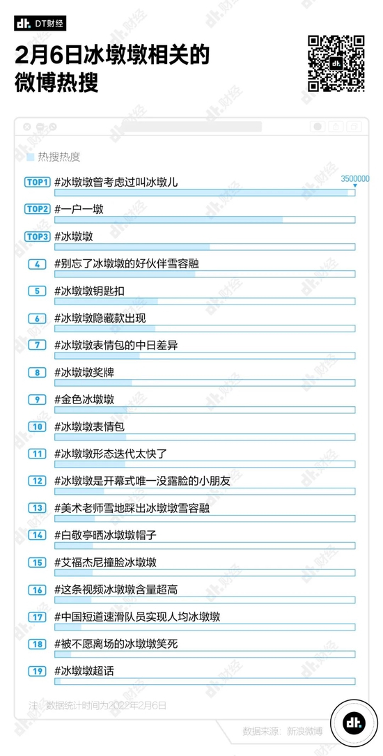 就拿微博来说,据不完全统计,仅2月6日一天,和冰墩墩相关的热搜就有19个。