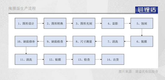 第三方掩膜厂商并非进行简单的加工,而是需要完成多达14个步骤才能最终交付订单,其中不乏光刻、显影、刻蚀、清洗、检测等芯片核心步骤。
