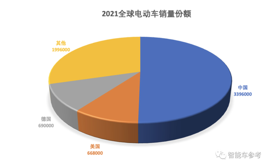其次,是中国市场的增长率。2021年中国共销售339万多辆电动车,同比增长155%,全球市场份额也上升了4.4%。