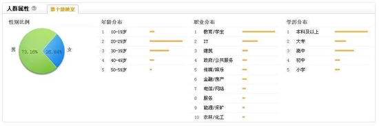 知乎问题“为什么男性观众是《第10放映室》的主要收视群体?”下,网友@图灵Don提供的一份来源不可考、发布于2013年的调查数据,也给予了相似的结论,认为《10放》观众群体主要由20-29岁的人群组成,职业上以学生、IT行业为主。