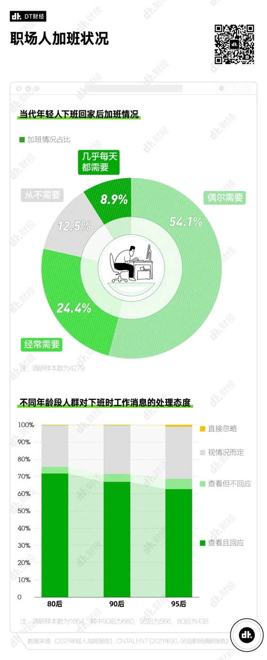 根据后浪研究所《2021年轻人加班报告》,仅有12.54% 的受访者表示下班回家后从不需要加班。超过6成人,会在下班后会回复工作消息。