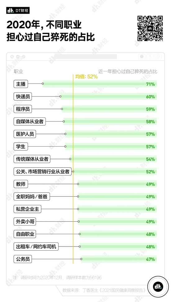 如果按职业来细分,有71%的主播曾担心自己会猝死,在所有职业中占比最高。其次是快递员(60%)和程序员(59%)。