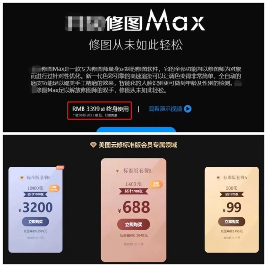 如果对比价格,美图的竞争力或许更弱一些。据了解,某业内知名智能修图软件实行买断制,3399元就能够满足小型摄影机构以及个人摄影师的修图需求,升级版本同样是买断制,29800元能够满足多人团队同时使用,共享预设数据,这一版本与美图云修更为相似。而美图云修目前为按张数收费,均价最低的为11000张的套餐,价格在3200元,几乎相当于买断一个个人版软件。