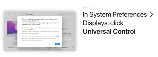 这个功能使用起来非常简单。首先,需要用同一个iCloud账户登入两个以上产品。此外,这些产品需要放在一起使用。最后,只需要稍微设置一下就可以了。例如苹果电脑的设置流程就是: 进入系统偏好设置-选择显示器-点击点击打开通用控制功能即可。