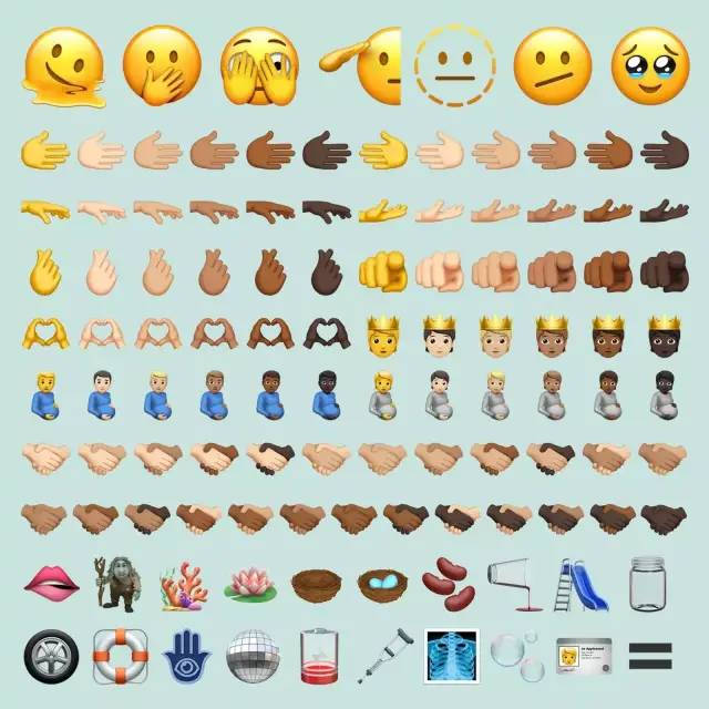 其中新的表情脸有:融化脸、敬礼脸、手捂嘴脸、偷看脸、斜嘴脸和虚线脸等等。
