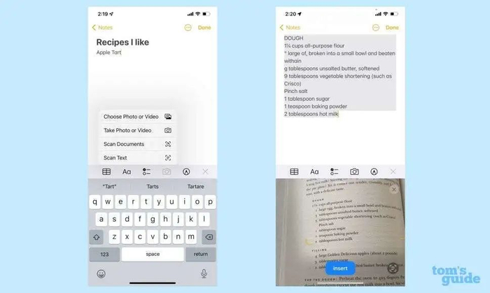 在新的「备忘录」App中,只要在App内打开相机图标,选择「扫描文字」,画面就会变成上下两个分割窗口。并且快速将镜头拍到的文字图案,转化为数码文档同步输入「备忘录」中,中英文都可快速辨识。