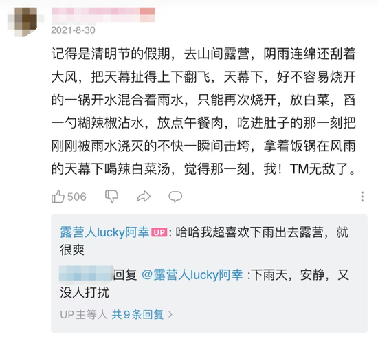 视频内容如标题所述,记录了一次简单又享受的山间露营,引发拥有相似露营经历网友的情感共鸣。截至目前,“露营人lucky阿幸”已经积累了6万B站粉丝跟3.6万小红书粉丝。