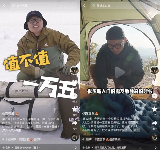 “露营叔”分享的内容以实用性强的科普和测评为主,比如科普新手怎么收纳睡袋,或者测评某款价值15000元的帐篷。为了在视频展示更多新鲜的露营好物,他时常从国内外户外品牌官网和新品发布会汲取选题灵感。