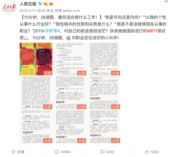 早在2015年4月11日,人民日报就曾发布MBTI测试相关微博——“10分钟,28道题,看你适合做什么工作!”,并打上了#2015求职季#的tag。