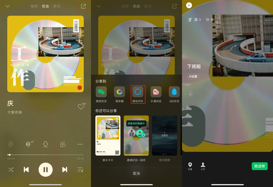 去年5月,微信状态支持QQ音乐一键分享。在QQ音乐选择喜欢的歌曲后,点击“分享”便可直接设置成状态,好友在状态中下拉便可播放音乐。
