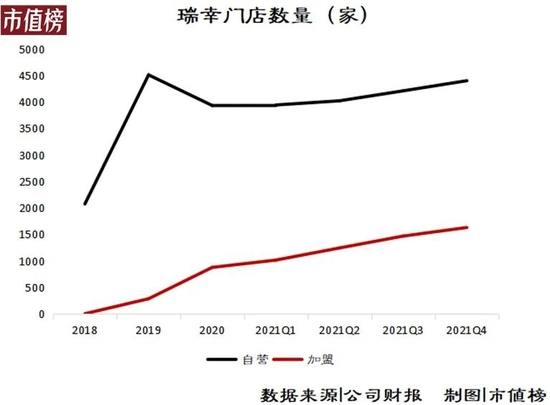 2021年,瑞幸的加盟店净增了753家,达到了1627家。从经营上看,2021年,加盟店为瑞幸带来了13.06亿元的收入,同比增长超过3倍。