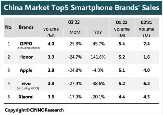 市场调研机构CINNO Research最新公布的报告显示,2月份中国市场智能手机销量约2348万部,同比下滑20.5%,环比下滑24.0%,同比环比双双出现收缩。其中,OPPO、荣耀、苹果、vivo与小米分别以400万、390万、380万、380万、360万台的销量位居第1-5位。值得注意的是,在排名前五的手机品牌中,只有荣耀同比上升141.6%,呈逆势增长趋势。