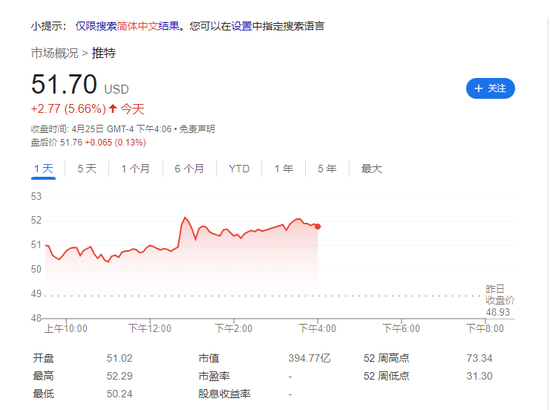 收购达成官宣后,Twitter 股价小幅上涨至接近52美元,当日收盘于51.70美元,涨幅5.66%——虽然距马斯克的报价仍有距离,但至少一定程度上扫除了过去两周以来的阴霾。