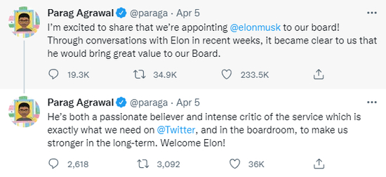 Twitter 现任 CEO Parag Agrawal 通过个人账号恭喜了马斯克加入公司,并邀请他加入董事会:“我非常兴奋地和大家分享,我们将任命马斯克加入董事会!通过最近几周和他的对话,我们越发相信,他将为董事会带来巨大价值。”