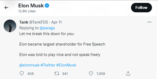 这句话在今天的语境下,意思就是马斯克将来还有可能继续增加持有的股份——果不其然,两天后,马斯克就对 Twitter 发动了总攻。