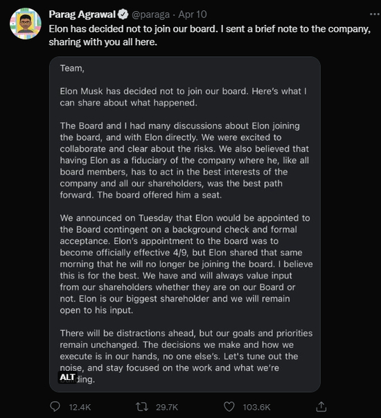 随后,Twitter 突然发布公告,宣布马斯克不想当董事。CEO Agrawal 表示,马斯克的董事任命本来在当天正式生效,然而董事会收到了马斯克的消息,表示不会加入董事会。“我相信这是最好的结果,”Agrawal 写道。