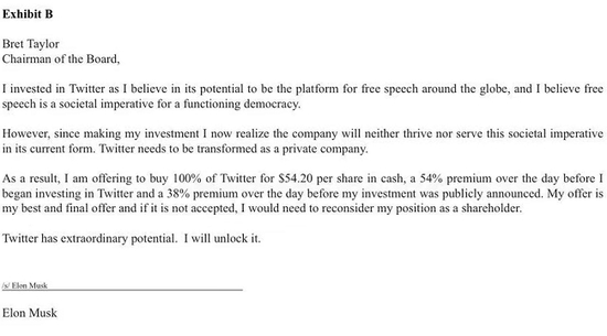在和 Twitter 董事长(同时也是 Salesforce CEO)Bret Taylor 的一通电话中,马斯克下达了自己的“最后通牒”:1)价格合适,股东会满意的;2)对 Twitter 现任管理层完全没有任何信心;3)这次是正经来收购的,不想跟董事会打太极拳;4)已经没有别的可选手段,最后才决定要收购;5)自己如果投资了一家公司,就一定要看到这家公司向好发展,然而以当时 Twitter 作为上市公司的身份呢是无法实现的,所以自己必须全面接管并且私有化退市。