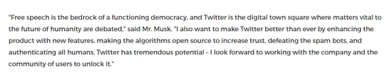 “Twitter 已经成为一个在线版的市民广场,很多对于人类未来尤为关键的话题讨论都在这里发生,”马斯克表示,“我希望用新的功能来强化这个产品;让 Twitter 的算法实现开源从而提升信任;打败平台上的垃圾机器人,并且对所有真人用户进行认证。(authenticating all humans)”