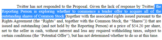 马斯克提交了一份文件,表示由于 Twitter 董事会对自己的收购请求没有回应,自己不排除有可能使用“要约收购”(tender offer) 的手段,也即不再通过 Twitter 董事会投票批准的方式,而是直接从其它股东手中收购部分甚至全部的股份,从而完成交易。