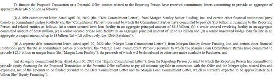 在该份文件中,马斯克也回应了坊间对于他没钱买下 Twitter 的传言,表示已经从包括摩根士丹利等金融机构拿到了超过250亿美元的债务融资/贷款承诺。,并且自己也将出资210亿美元。