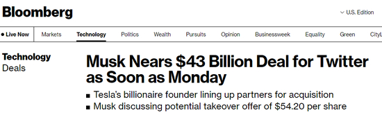 Twitter 发布了一篇官方新闻,表示董事会已经全票通过并接受了马斯克的收购和私有化要约。公司将以每股54.2美元的价格,约合440亿美元的总计交易规模,全资出售给科技富豪马斯克。