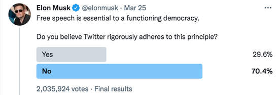 在这段时间里,他一直在自己的 Twitter 账号上发表对于这家公司的各种看法意见,比如在3月25日,他发布一项投票,询问粉丝是否认为 Twitter 遵守“Free Speech”原则,结果有超过200万用户参与投票,其中七成认为 Twitter 在这一点上不合格。